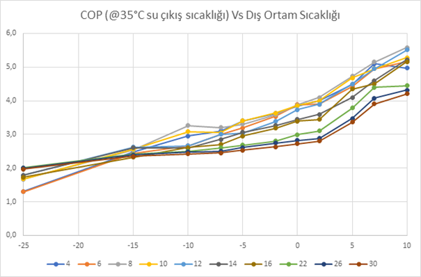 - Elektrik Tüketimi: Dış ortam sıcaklığı düştükçe COP azalır, buna bağlı olarak elektrik tüketimi artar.